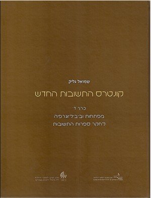 כרך זה, הכרך הרביעי והאחרון של "קונטרס התשובות החדש", כולל את מפתח העניינים ומבחר ביבליוגרפי בחקר ספרות התשובות. החלק הראשון – מפתח העניינים לג' הכרכים הקודמים של ה"קונטרס" – כולל למעלה מ-12,000 ערכים (נושאים ותת-נושאים) המתמקדים בהיבטים הלכתיים-היסטוריים וביוגרפיים בתוך 4,560 הספרים שתיאוריהם מובאים בג' הכרכים הקודמים. מאליו מובן כי אין זה אלא המעט המעיד על המרובה שבספרות השו"ת. החלק השני – ביבליוגרפיה בחקר ספרות התשובות – כולל רשימה ביבליוגרפית ממוינת של מאמרים, מחקרים, ומונוגרפיות בעברית ובלועזית, שנכתבו משנת תקפ"ג (1823) ועד לשנת תש"ע (2010) על ספרות התשובות ועל משיבים. הרשימה כוללת למעלה מ-2430 פריטים, המסודרות בקטגוריות ותת-קטגוריות המאפיינות את תחומי המחקר השונים בספרות השו"ת.